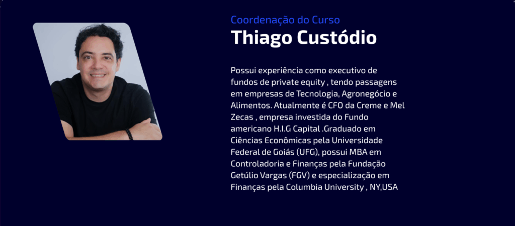 Com uma matriz atualizada e orientada para o futuro, o curso prepara o profissional para atuar em cargos de liderança, consultoria empresarial, planejamento estratégico, investimentos e controladoria financeira de alto impacto, tornando-o protagonista em um mercado cada vez mais competitivo.